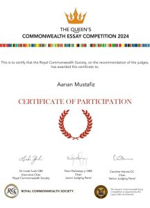 আনান মুস্তাফিজকে রয়েল কমনওয়েলথ সোসাইটি থেকে দেয়া সনদ