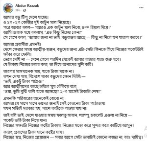 সম্প্রতি এসব দুঃখের কথা ফেসবুকে লিখেছেন একজন প্রবাসী। তার সেই লেখা শেয়ার নিয়েছেন সৌদি আরব প্রবাসী আবদুর রাজ্জাক। পাঠকদের জন্য হুবহু তুলে ধরা হলো প্রবাসী বাংলাদেশির আর্তনাদের কথা…